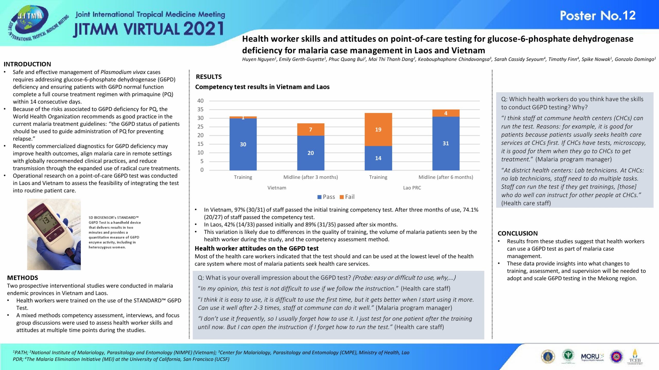 HEALTH WORKER SKILLS AND ATTITUDES ON POINT-OF-CARE TESTING FOR GLUCOSE-6-PHOSPHATE DEHYDROGENASE DEFICIENCY FOR MALARIA CASE MANAGEMENT IN LAOS AND VIETNAM